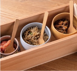 焼鮭、出来立てのだし巻き玉子、京のおばんざいが付いた体にやさしい「京の朝ごはん」を、六角キッチン風にアレンジ。ごはんのお供に厳選された「ちりめん山椒、明太子、佃煮」で彩りを添えて。